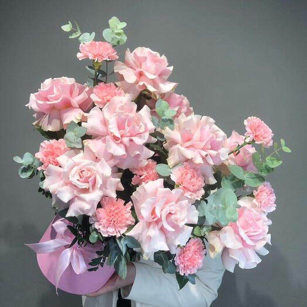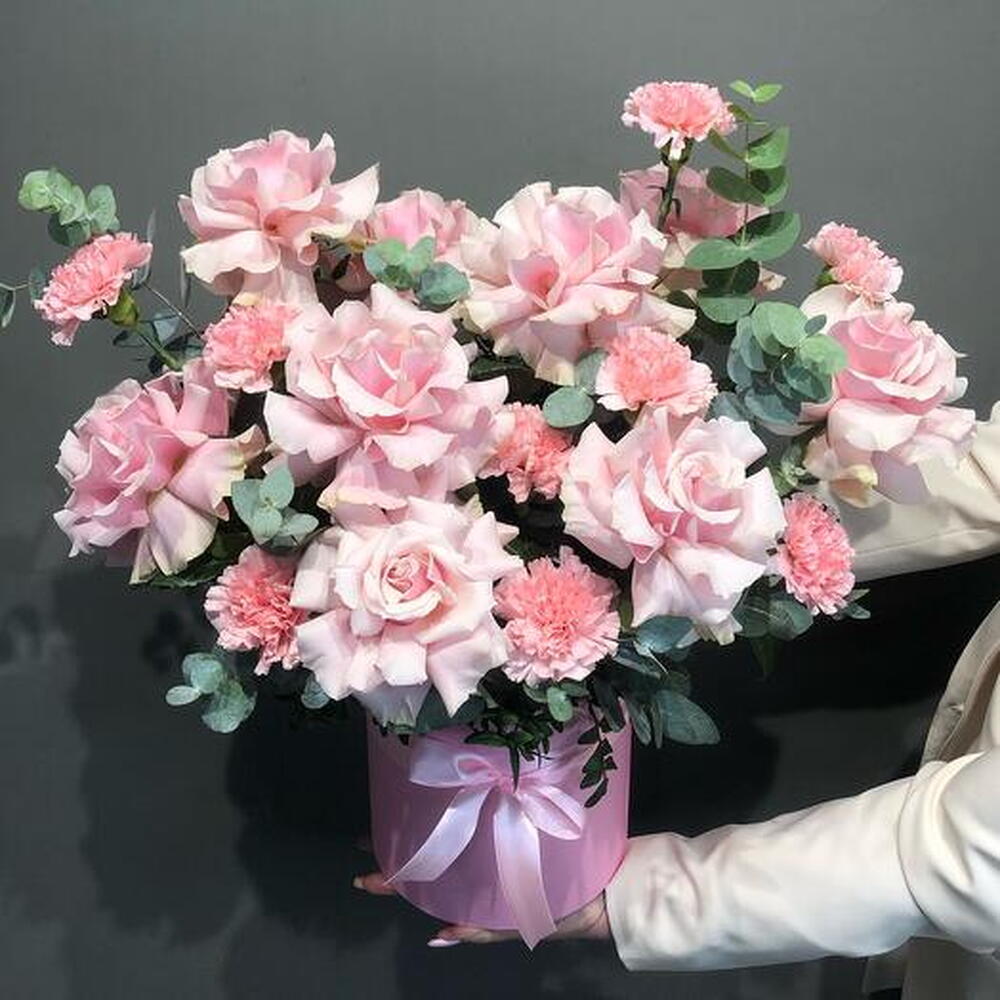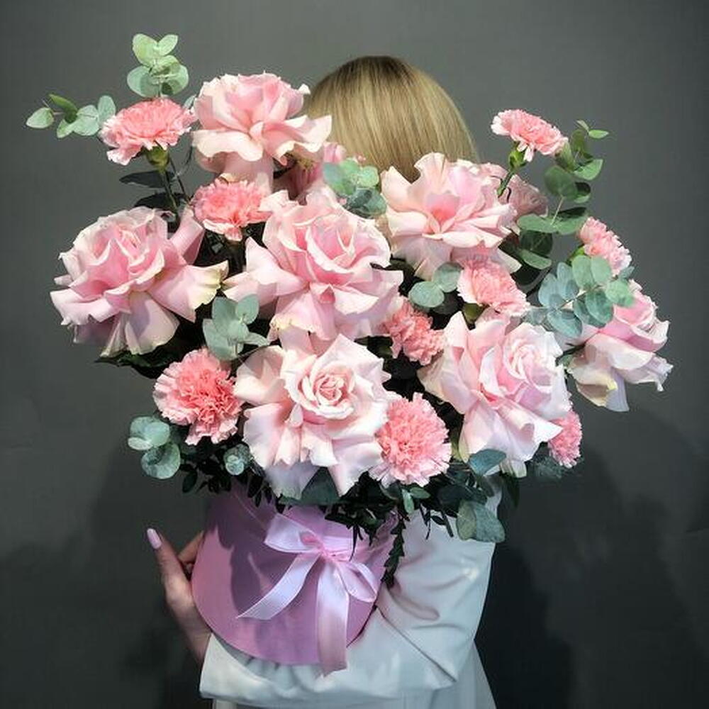 Цветы в коробке "Шанталь" (Роза французская, эвкалипт)