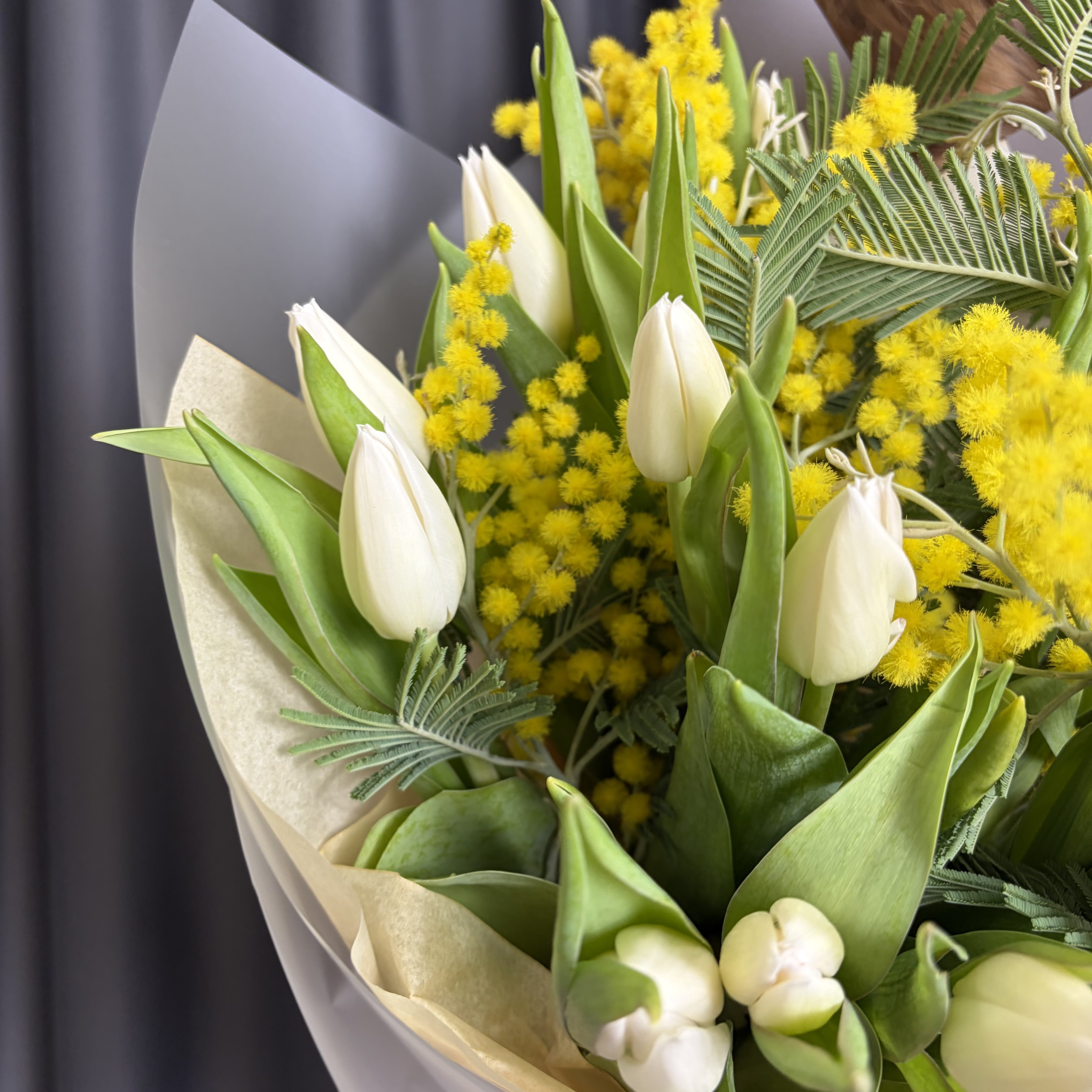 Белые тюльпаны и мимоза
