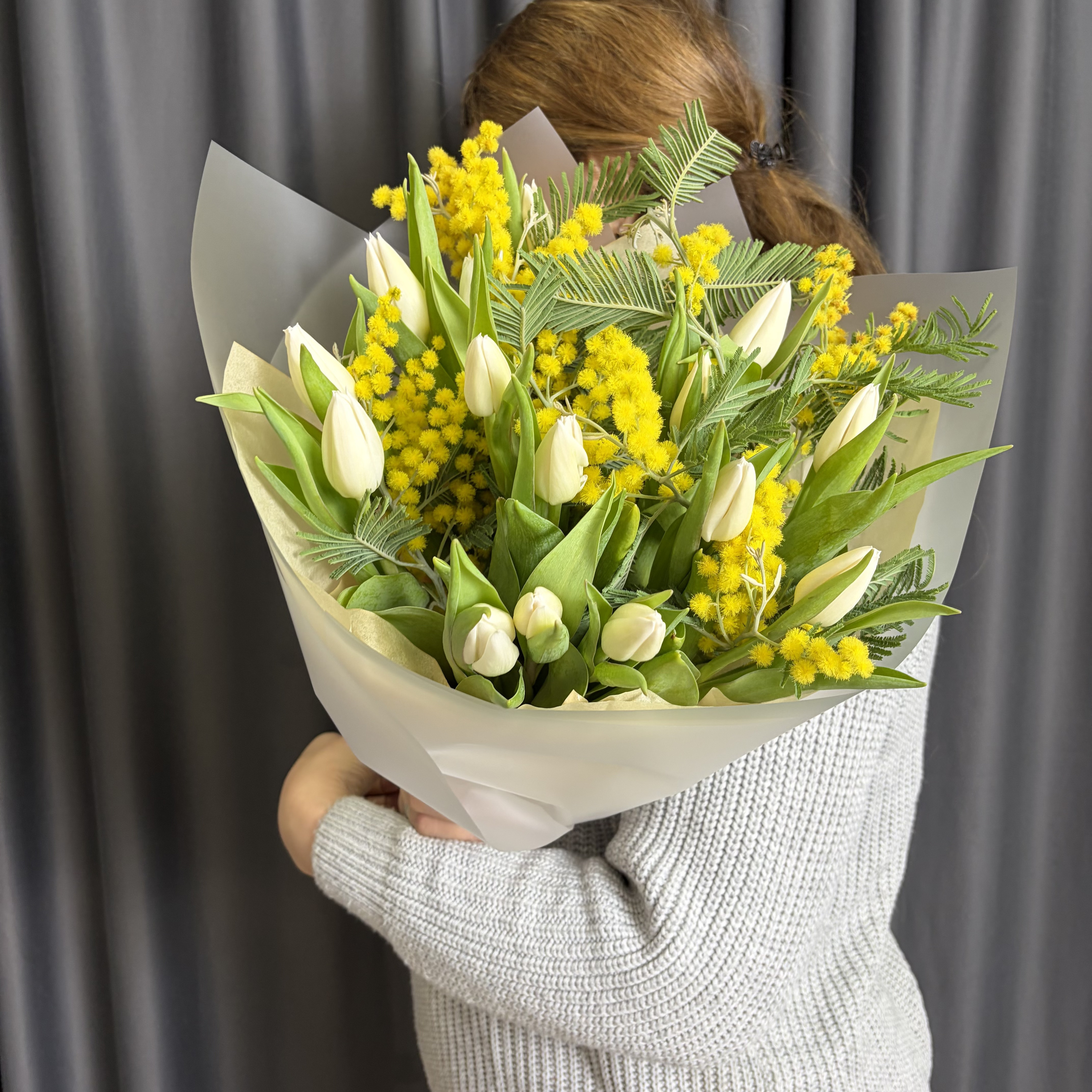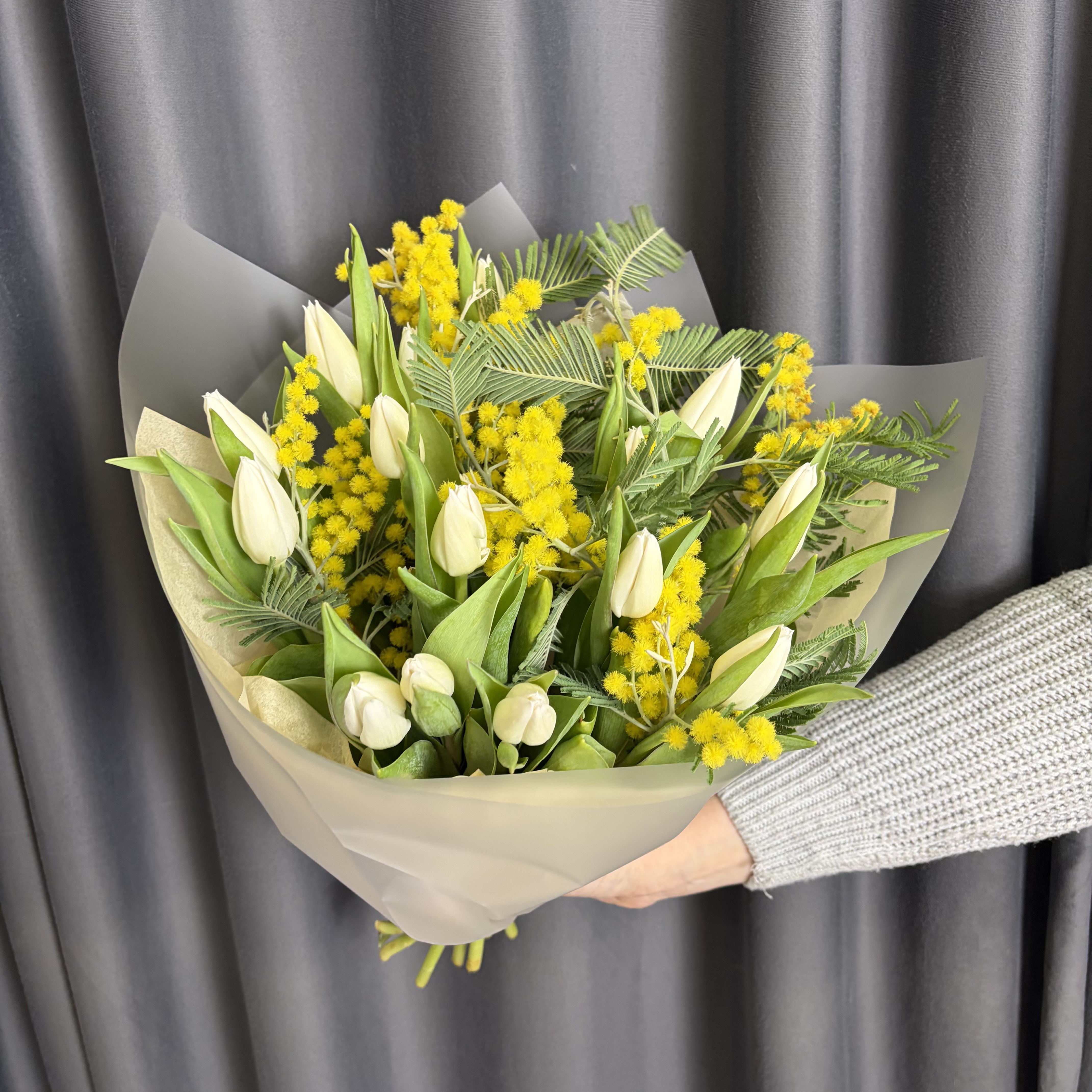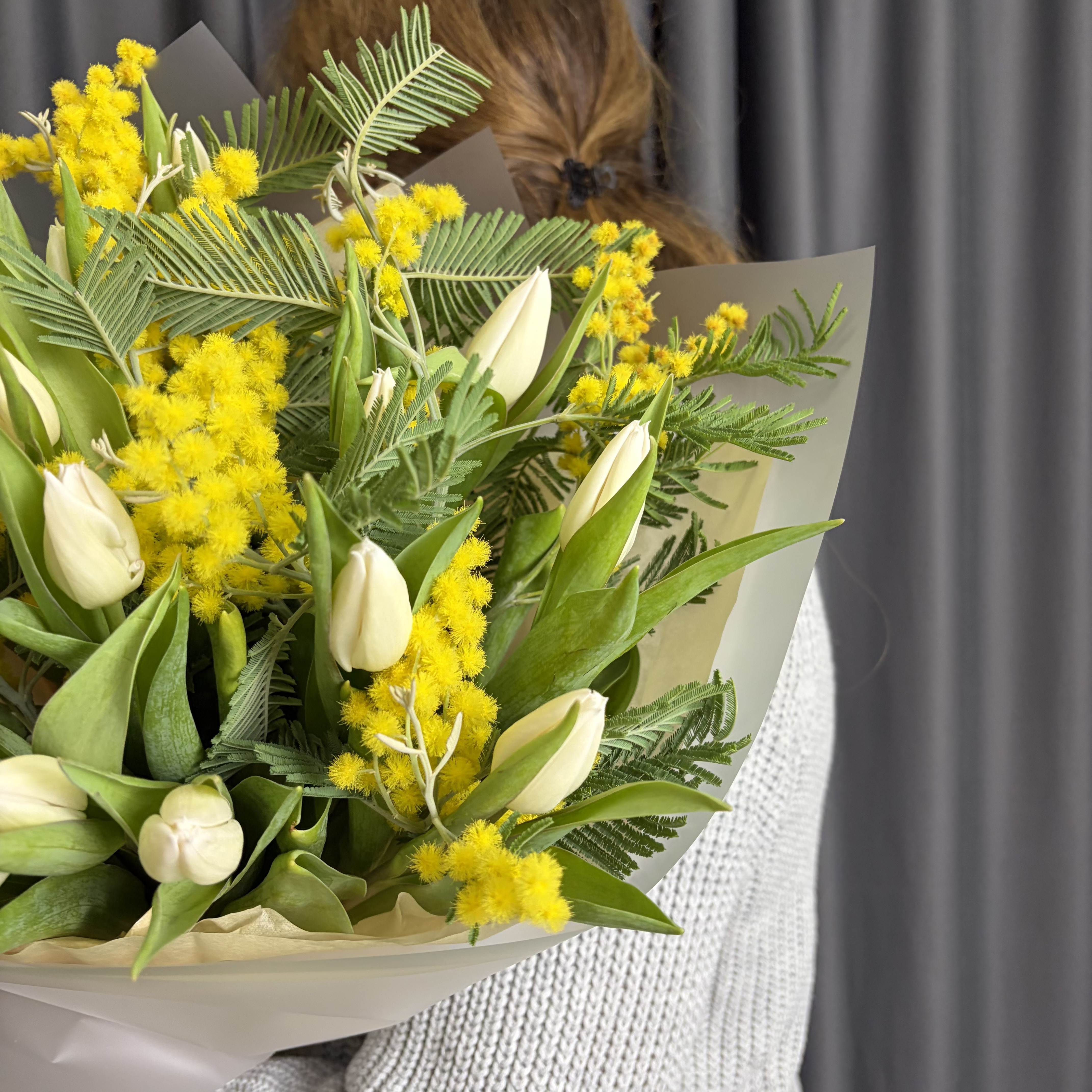 Белые тюльпаны и мимоза – купить за 5 500 ₽ | УНА ФЛОР