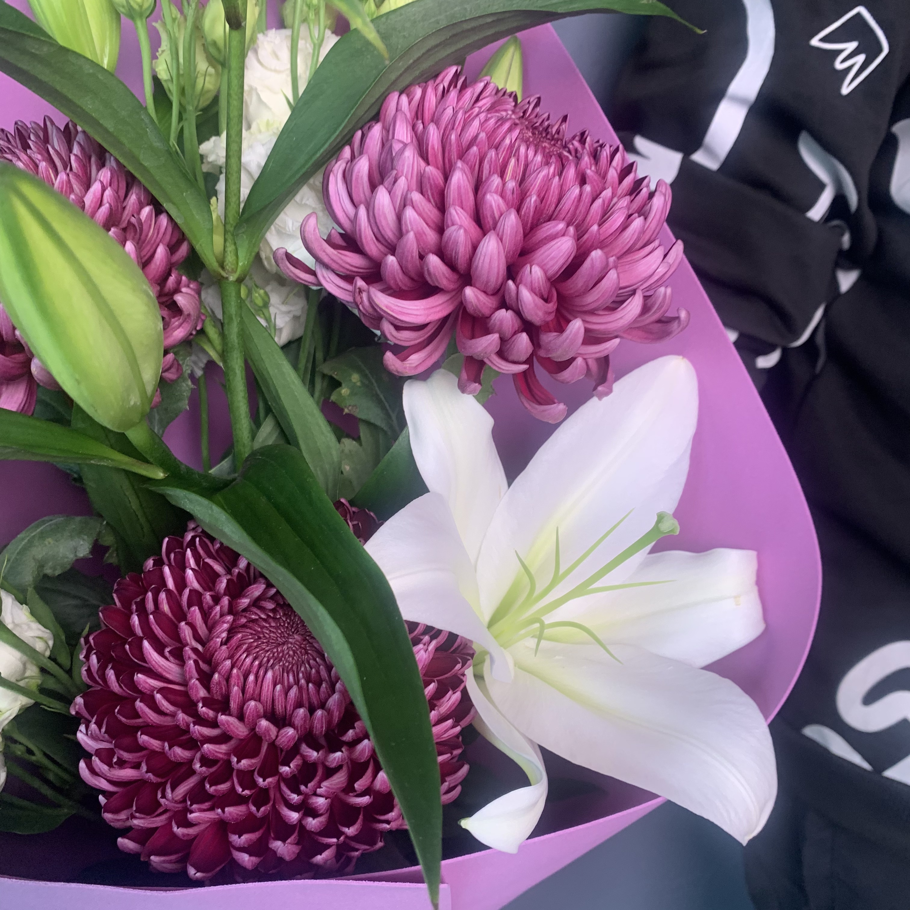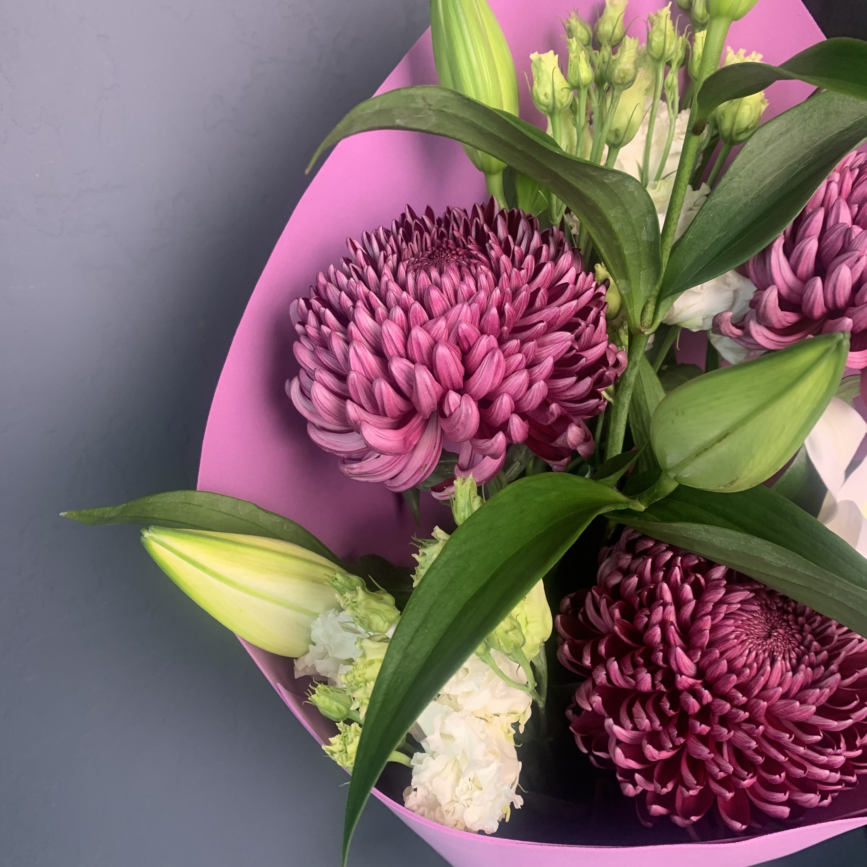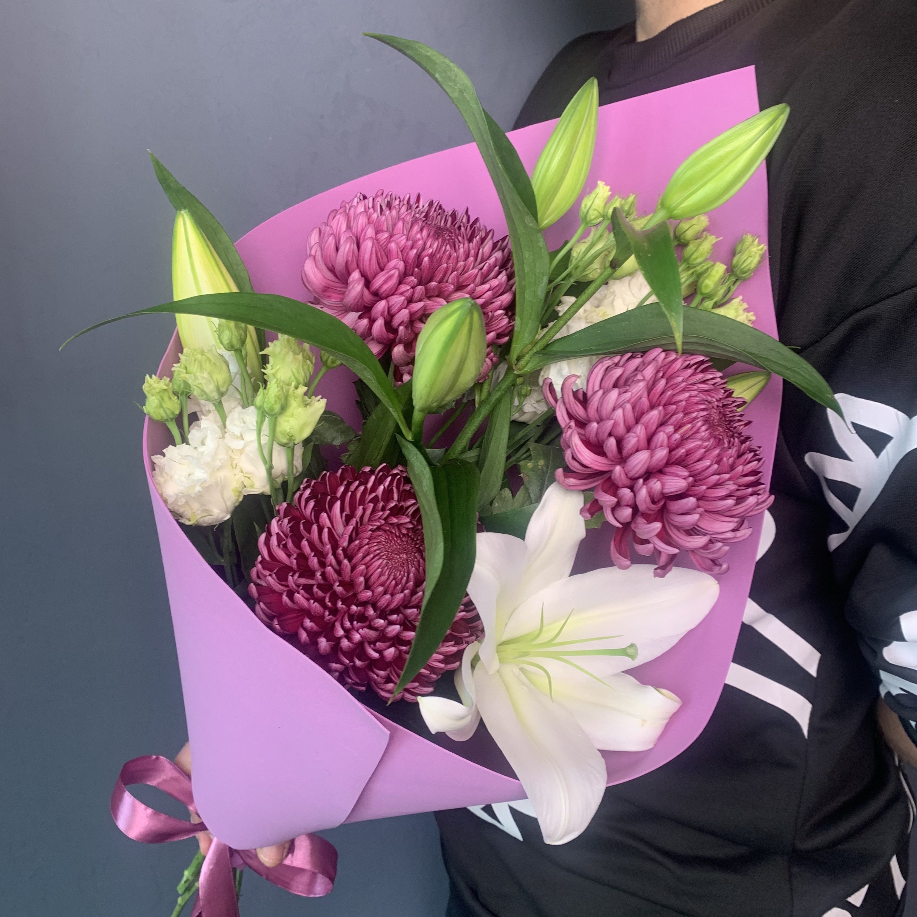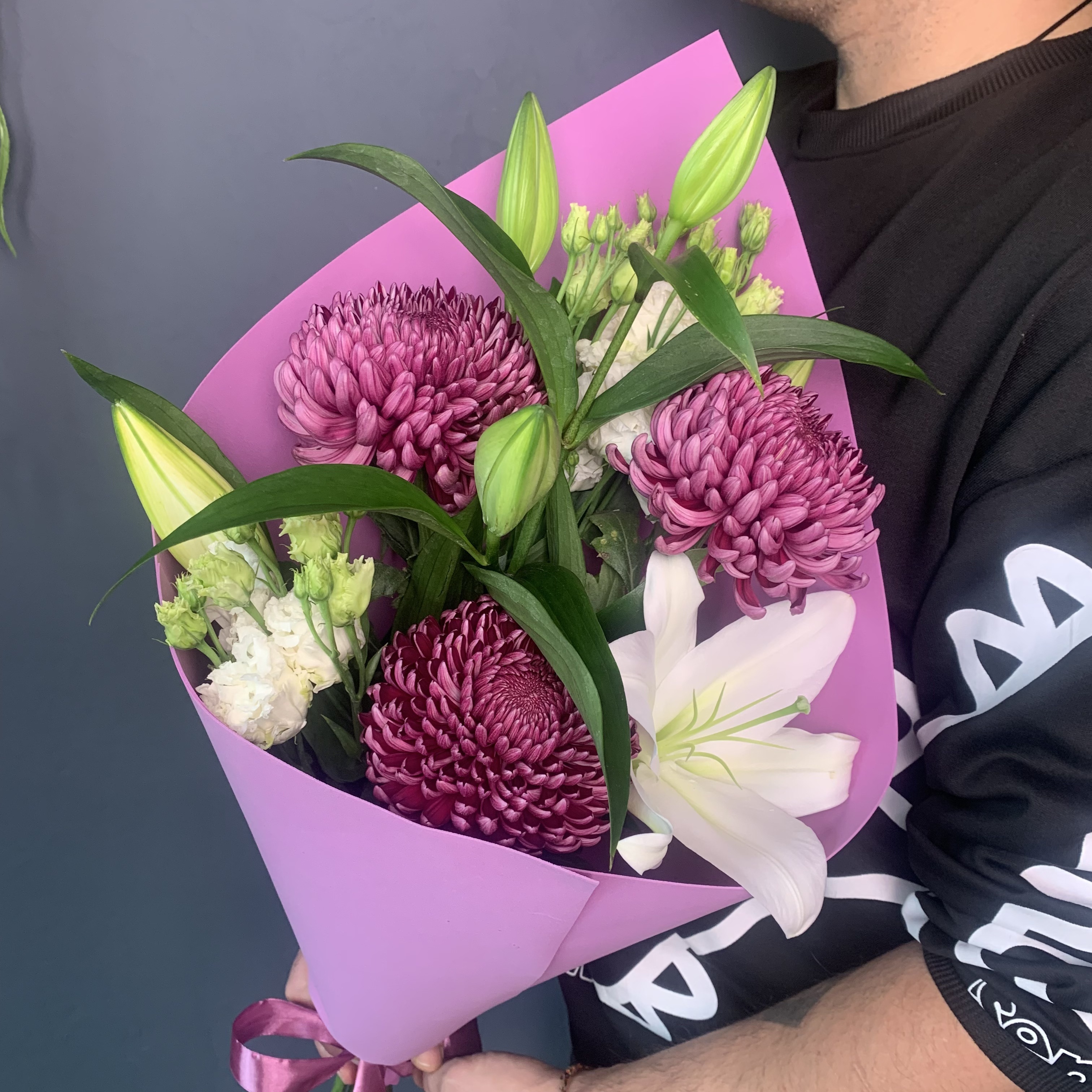 Букет "Фатеж" хризантема Бигуди и лилия – купить за 4 350 ₽ | УНА ФЛОР