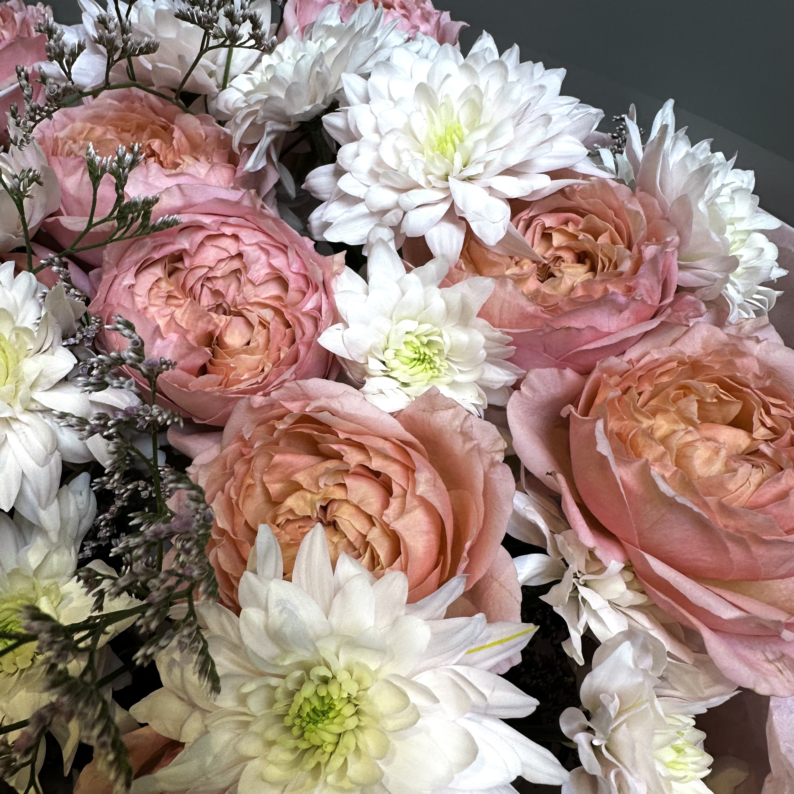 Букет"Лея"(кустовая пионовидная роза ,кустовая хризантема)